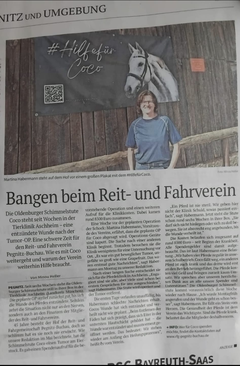 Ebenso danken wir Radio Mainwelle und dem Nordbayerischen Kurier für die großartige Berichterstattung – durch Euch wurde Cocos Geschichte weit über unseren Stall hinaus bekannt. 🙏